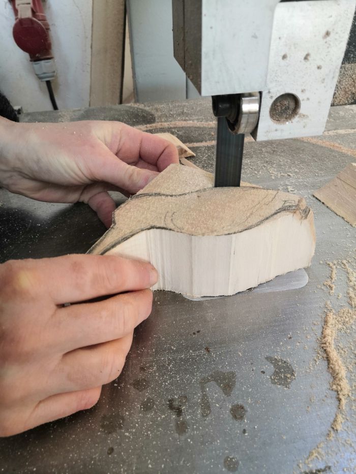 Materiál na ledňáčka je vyříznut a naformátován na hrubé základní tvary na pásové pile.