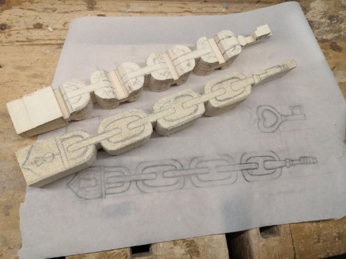 Získáte na pásové pile správně připravený materiál s naznačenými tvary jednotlivých článků řetězu, zámku a klíče v jednom pevném kusu.